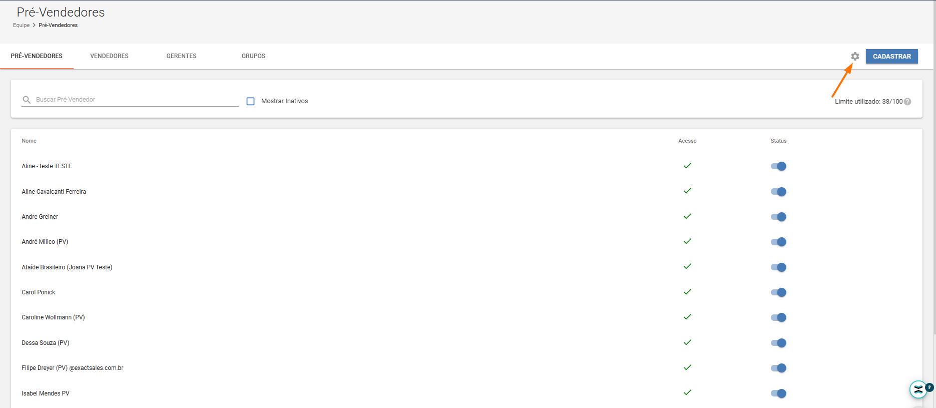 Consulte e libere permissões do Exact Spotter com uma conta Gerente através do menu Equipe > Pré-Vendedores/Vendedores >