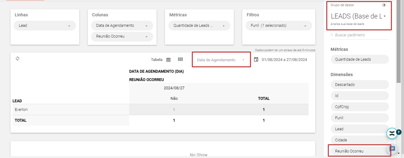 Para trazer as informações de agendamento marcadas como ''reunião ocorreu? - Não'', é possível puxar pelo Business Analytics, utilizando o grupo de dados Leads, selecionando a dimensão ''Reunião ocorreu'':