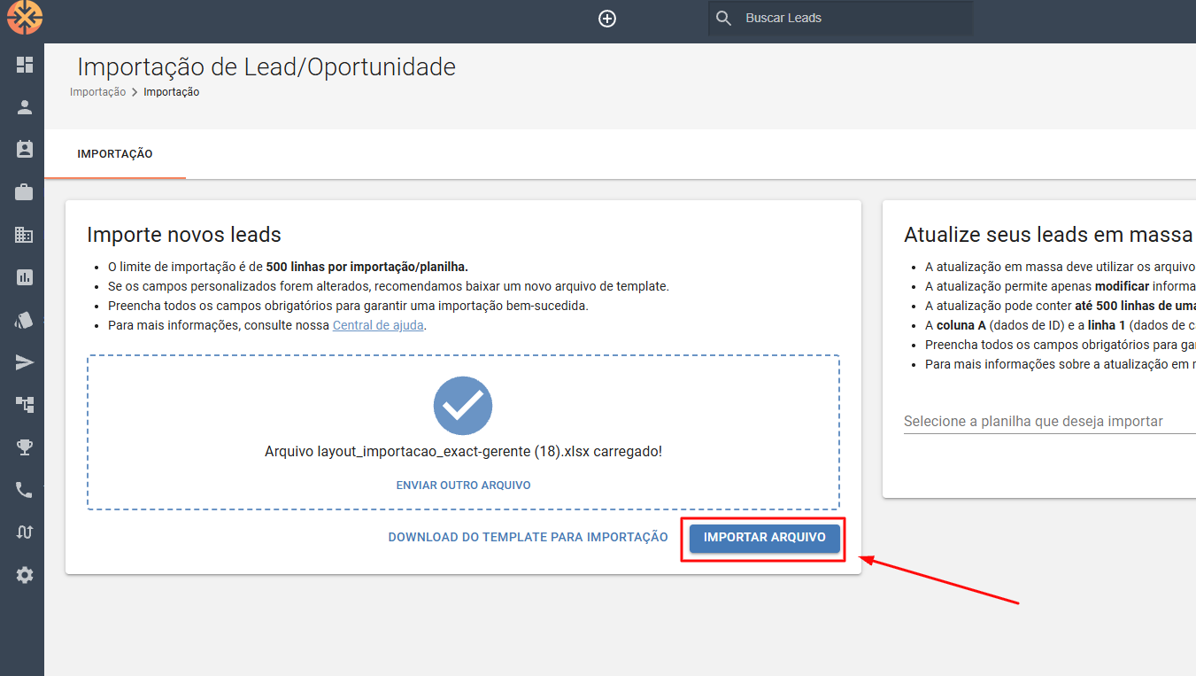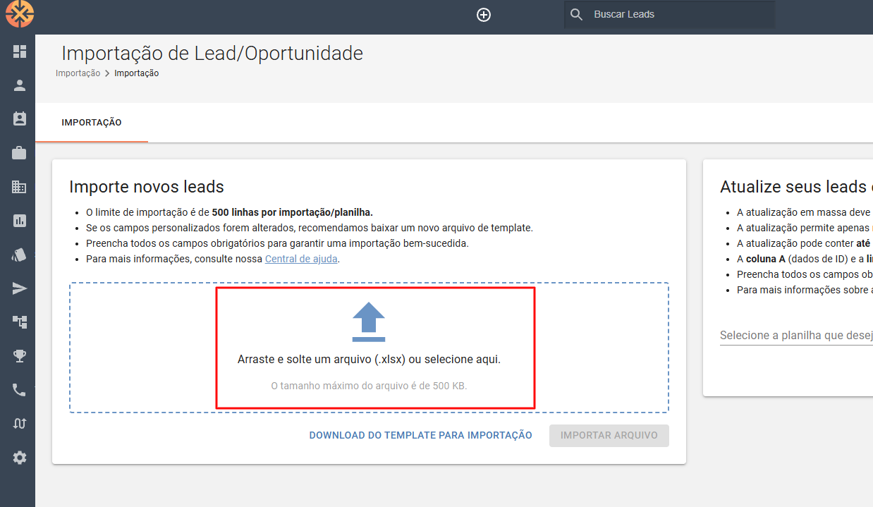 1. Com o seu usuário logado no sistema, acesse no menu lateral esquerdo a opção Leads/Oportunidade > Importar Leads.