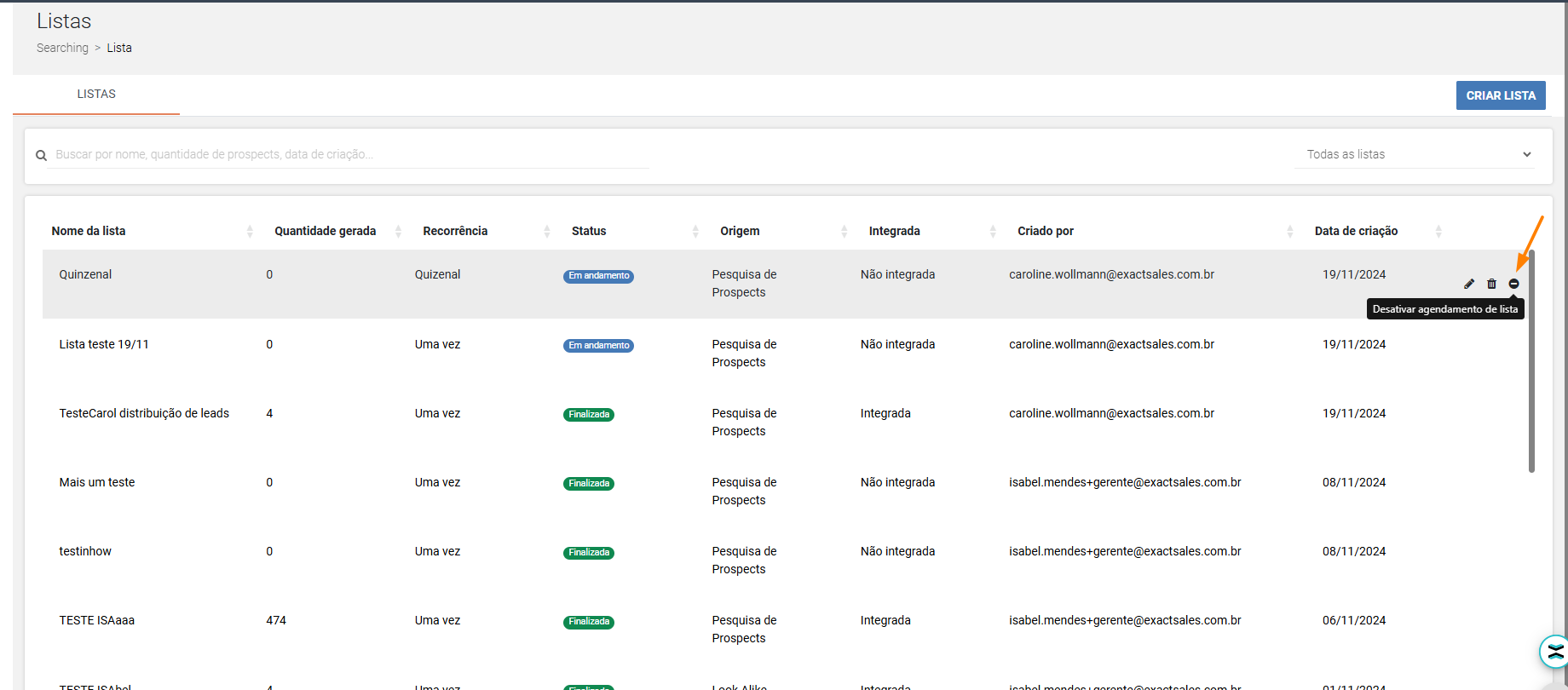 Pronto, agora para visualizar sua lista agendada basta ir na aba "Listas" e lá você conseguirá ver quais listas estão ativas e quais deseja inativar para que não se repitam: