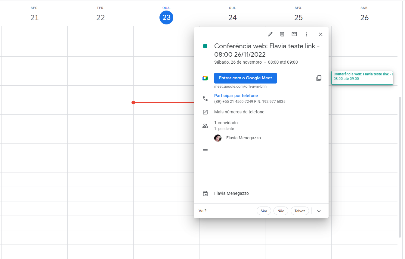 Dessa forma vamos "bloquear" aquele horário na agenda no lead. Lembrando que o evento criado precisa também ser aceito pelo lead: