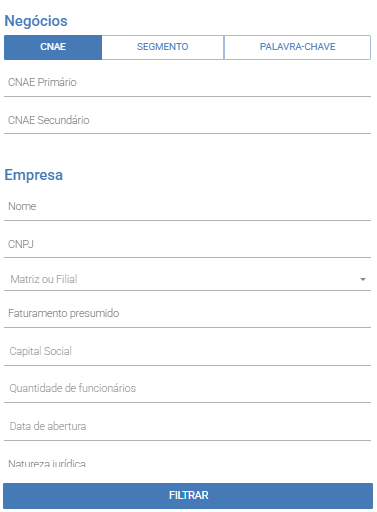 Os filtros de negócio tem a regra OU aplicada. São distintos e a nossa recomendação é utilizar apenas 1 deles: ou segmento, o CNAE, ou palavra chave.