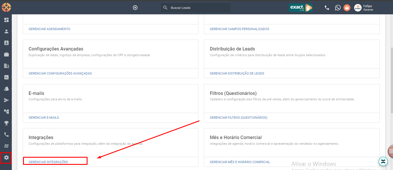 Passo 1: Acesse no Menu lateral esquerdo > Configurações > Integrações