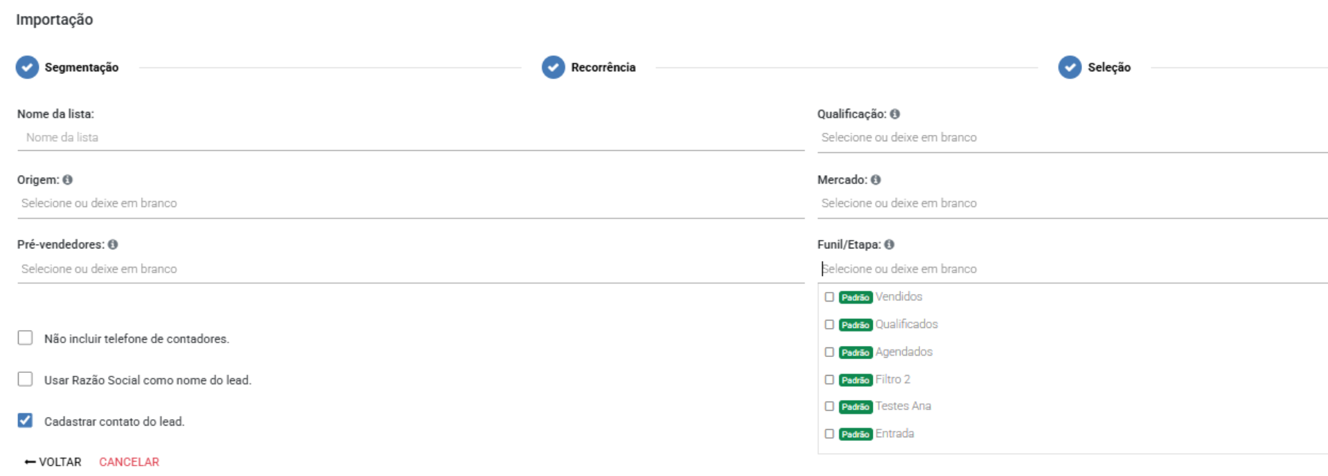Aqui serão definidos os parâmetros de Origem/Mercado e Funil/Etapa dos leads vindo dessa lista: