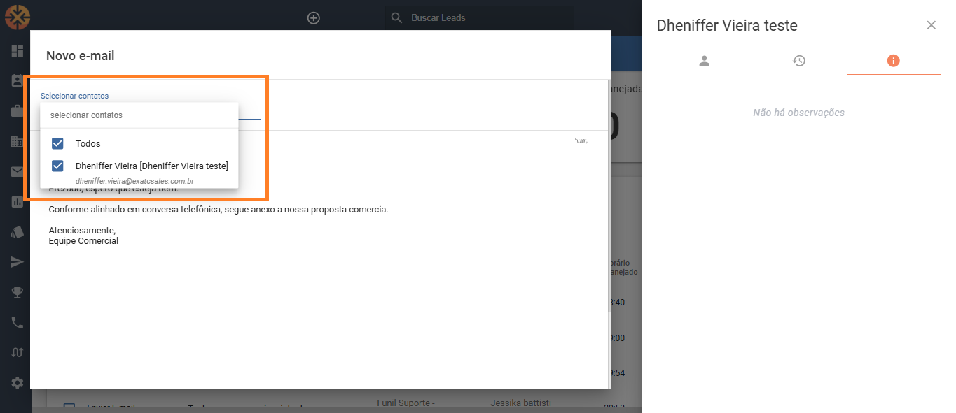 Envio Flexível: Envie o e-mail para um contato específico ou para todos os contatos associados ao lead, de forma prática.