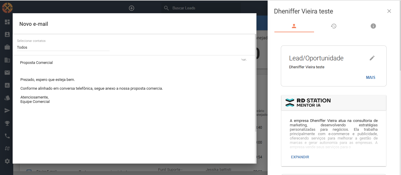 O envio de e-mail individual foi reformulado para oferecer uma experiência ainda mais prática e eficiente. Com o novo layout, você pode personalizar suas mensagens de maneira rápida, ter acesso às informações detalhadas do lead e acompanhar o histórico de interações, tudo em uma única tela.