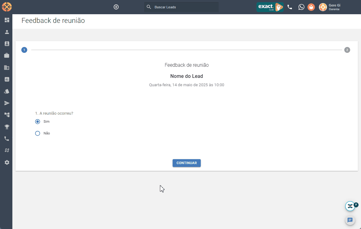 Execução de “Continuar Filtro” direto da nova tela: a atividade Continuar Filtro ganhou nova cara e fluxo otimizado: visualização lateral completa do lead, sem sair da tela e conclusão da tarefa avança automaticamente o lead no funil.