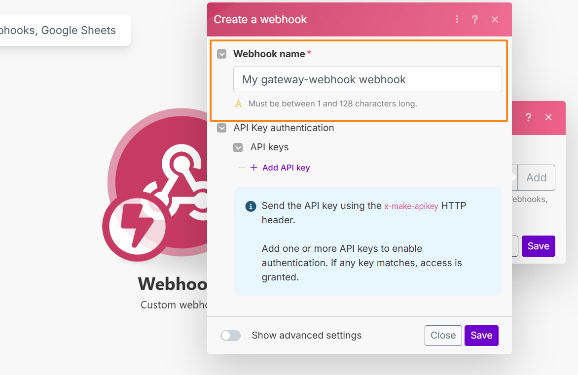 Iremos preencher apenas o campo Webhook Name, ignorando API KEYS