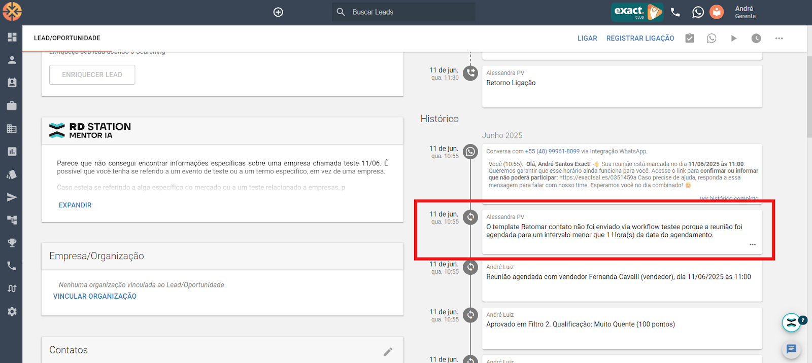 Agendou em cima da hora? O HSM não será enviado e o motivo será registrado automaticamente na timeline.