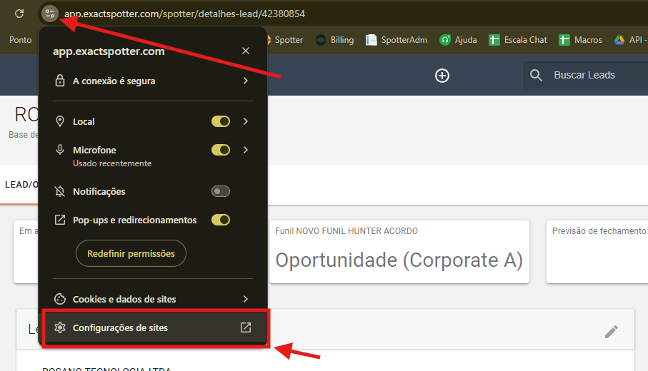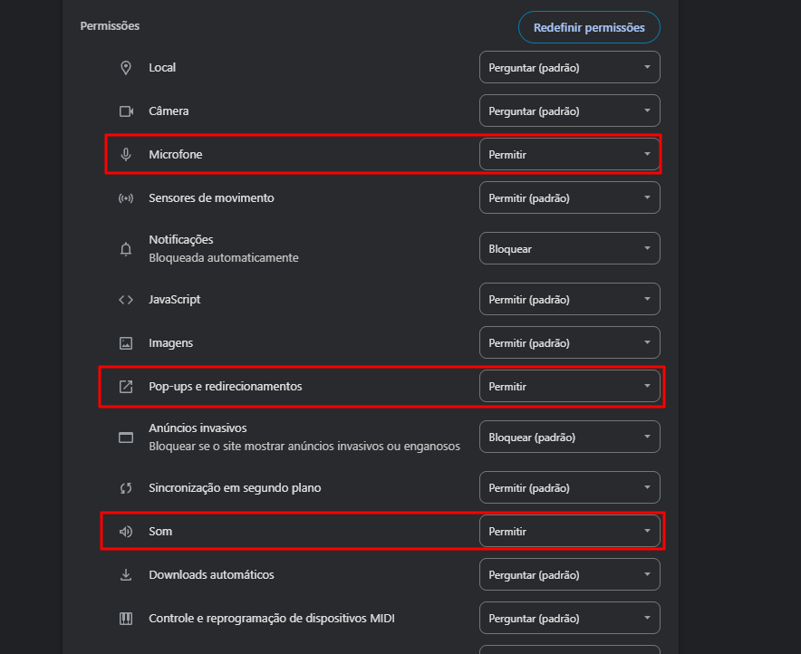 1.2. Ative as permissões de Microfone, Pop-ups e redirecionamentos, e Som definidos como Permitir;