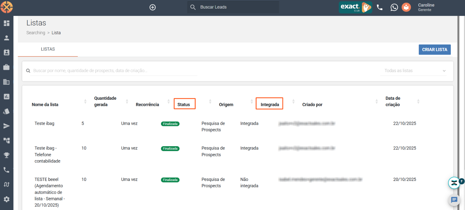 Além do status da lista, existe a coluna “Integrada”, que indica se essa lista foi compartilhada/integrada no funil.